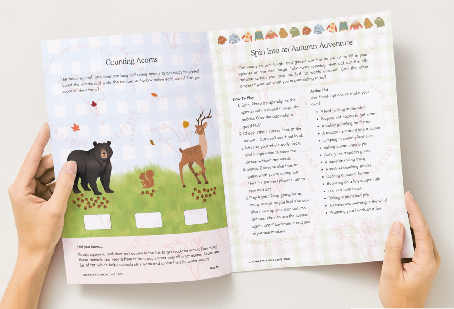 Celebrate, play, and learn with themes inspired by the seasons around us. Think of them as life connectors! Our Adventure Activity Books integrate STEAM-centered activities with screen-free fun for families, individuals, or groups. Each book weaves together prompts, games, and projects that not only explore science and creativity but also support social-emotional learning (SEL) to help children thrive and connect in everyday life.