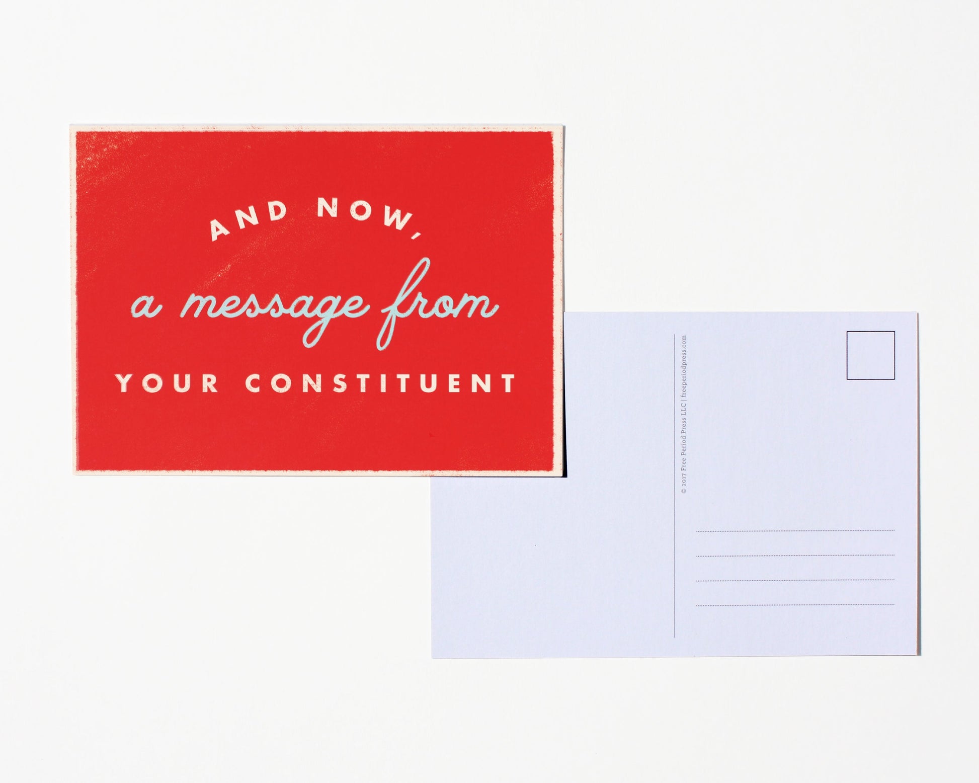 Visual Description: Horizontal red postcard with beige border reading "and now, a message from you constituent". The back of the postcard is white with lines for addressing and a square for placing a stamp.