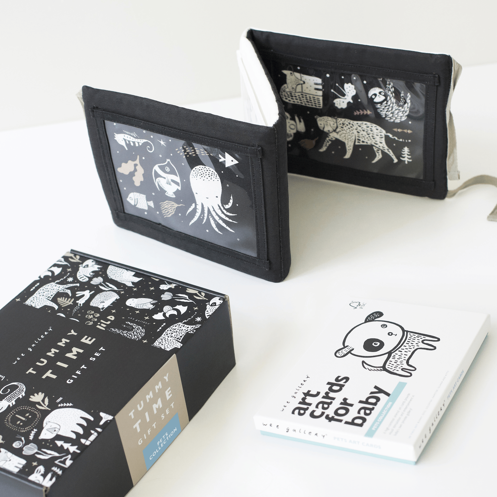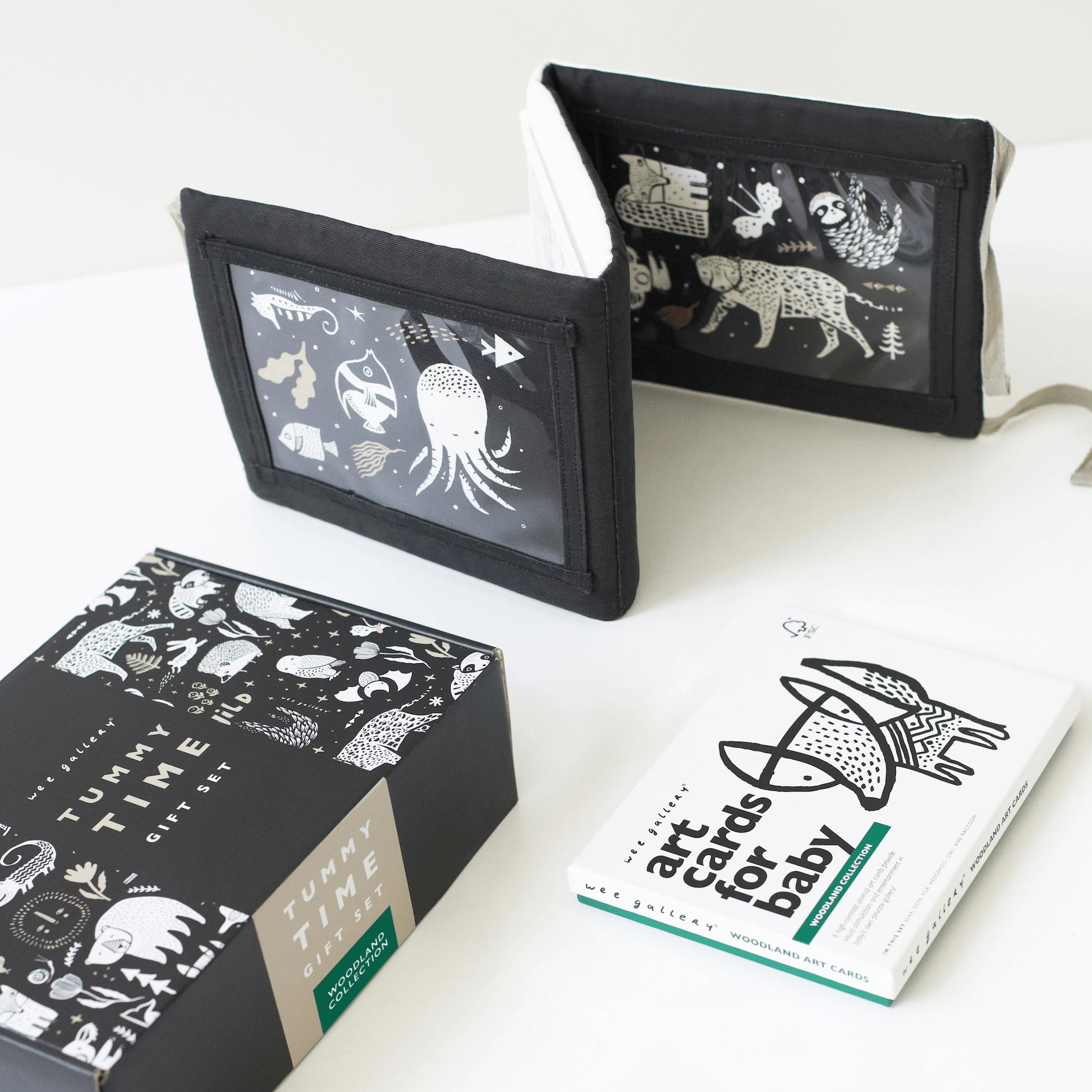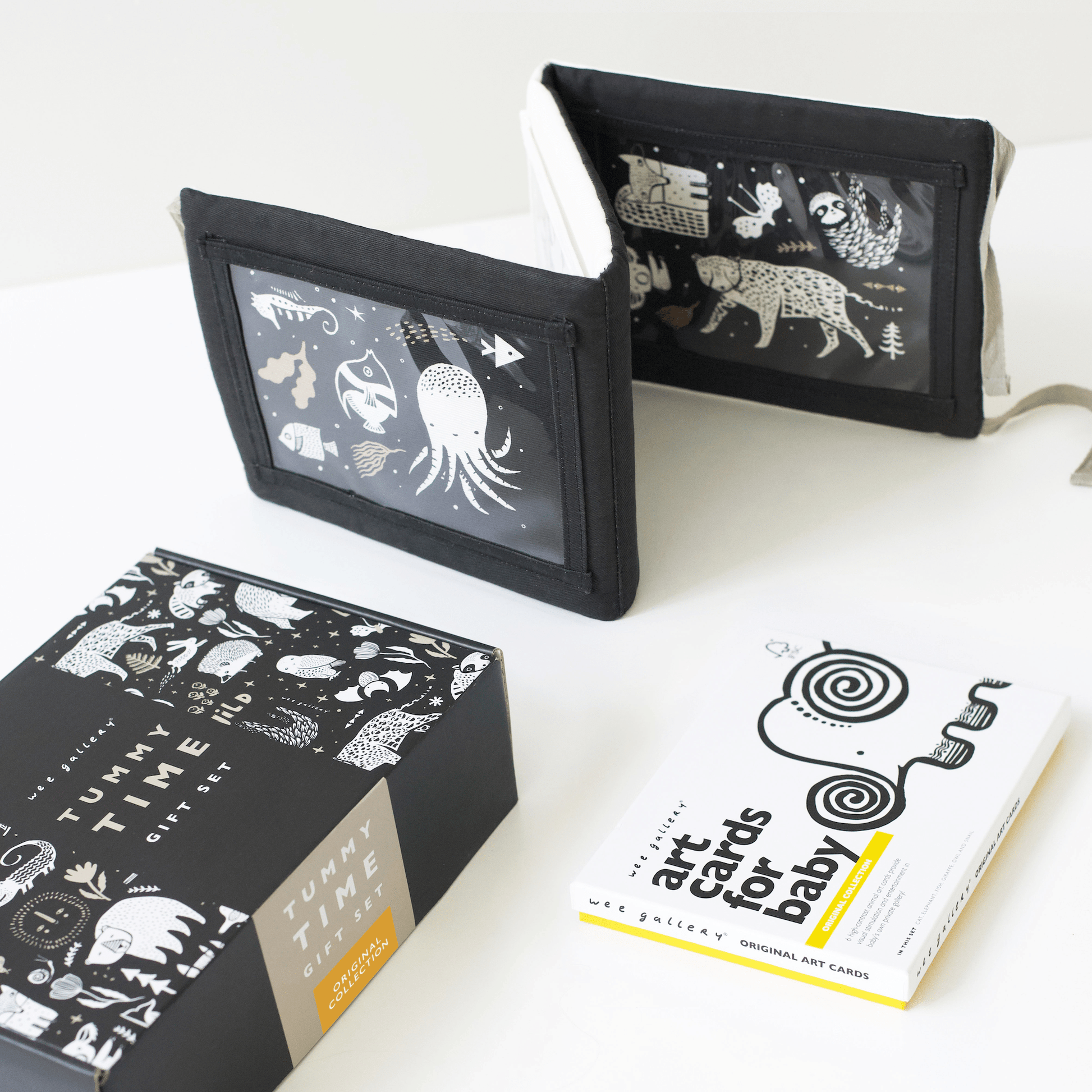 The Tummy Time Gift Set pairs together our best-selling Tummy Time Gallery and your choice of Art Cards for Baby — all in a beautiful custom gift box! The reversible Tummy Time Gallery space has many opportunities for stimulation. Illustrated graphics, embroidered features, and pockets for the included Wee Gallery 5x7 inch Art Cards. Select the design of Art Cards that you would like to pair with your Tummy Time Gallery to create your own special gift set.