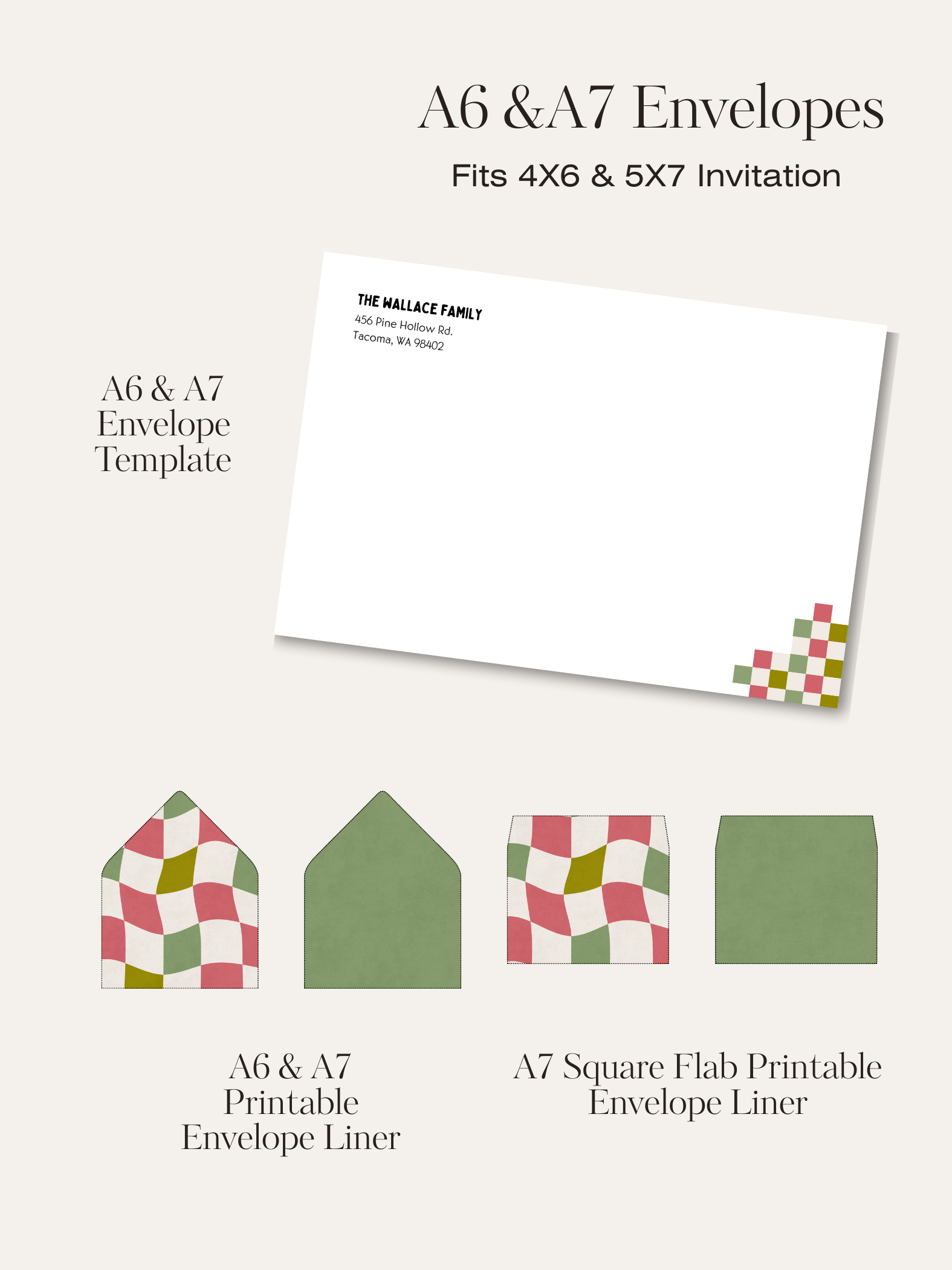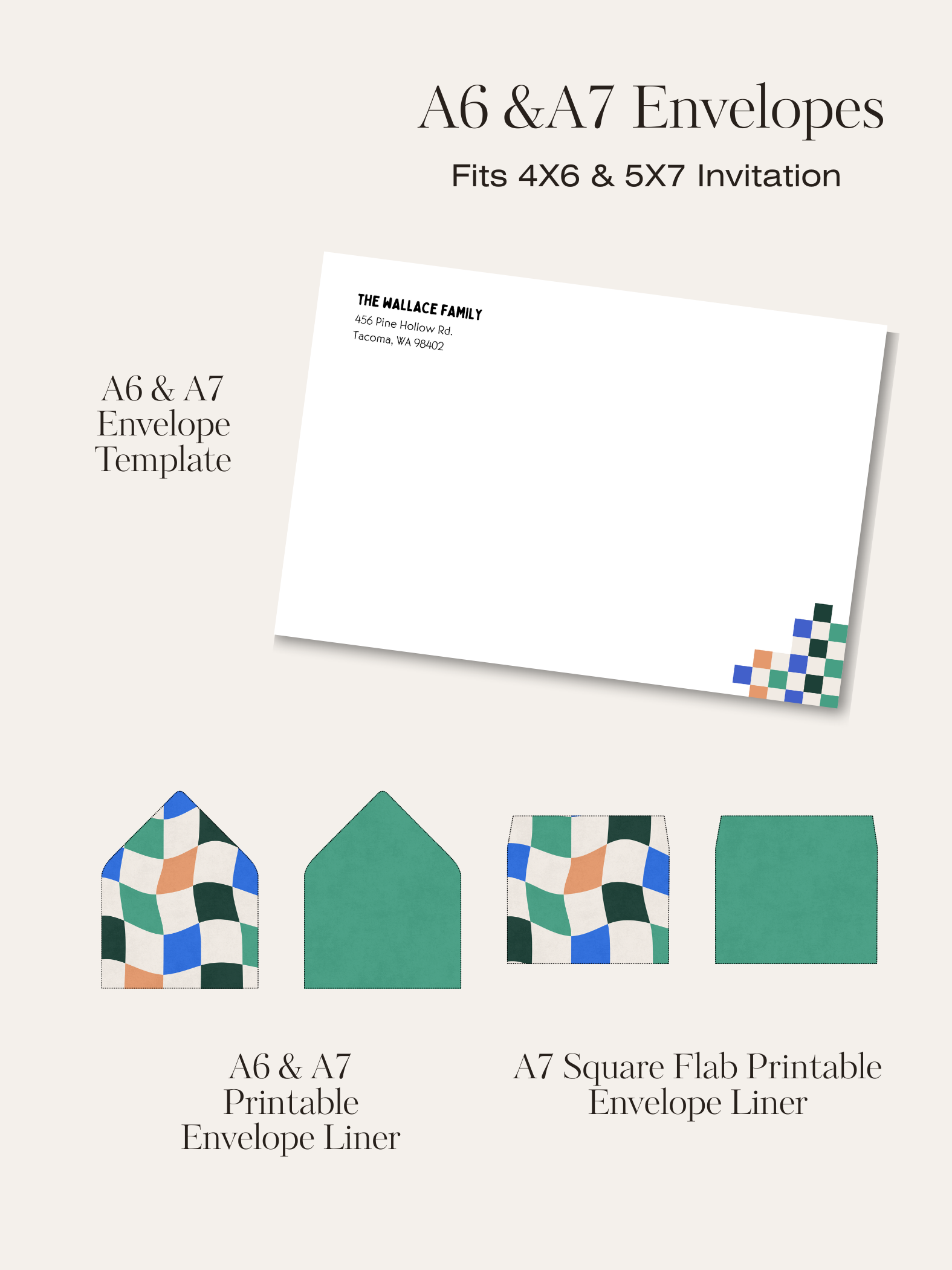 Bold wavy checks, cheerful colors, and playful typography are the perfect start to any celebration!
