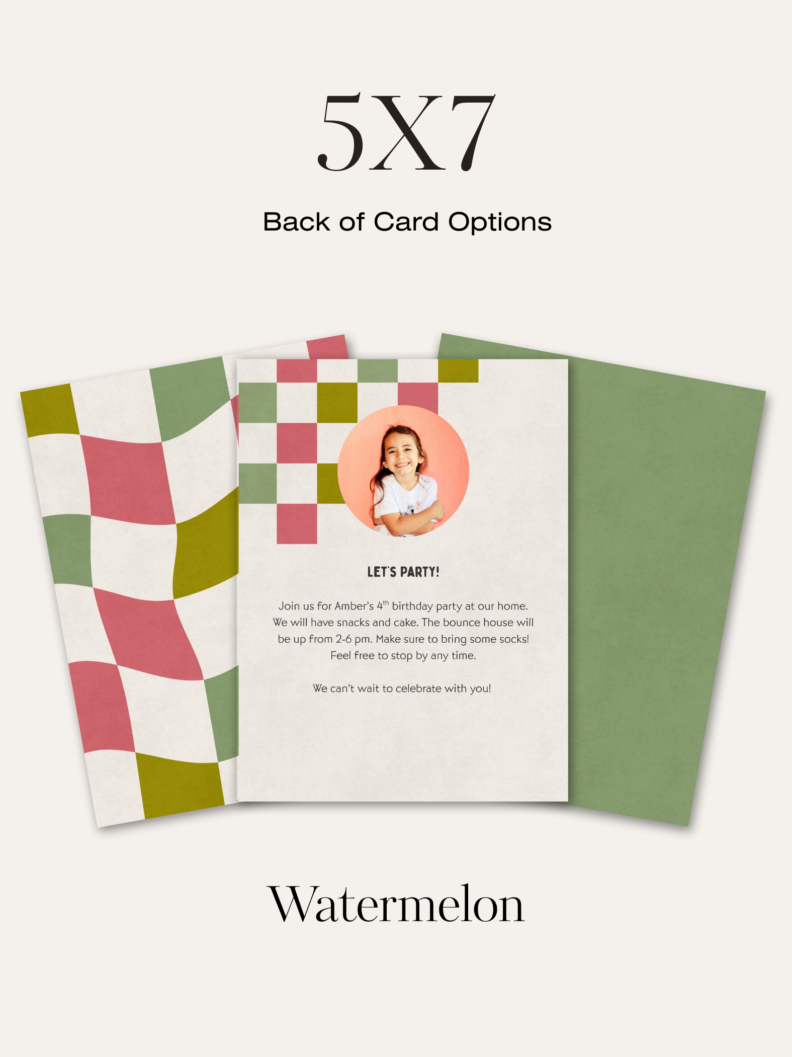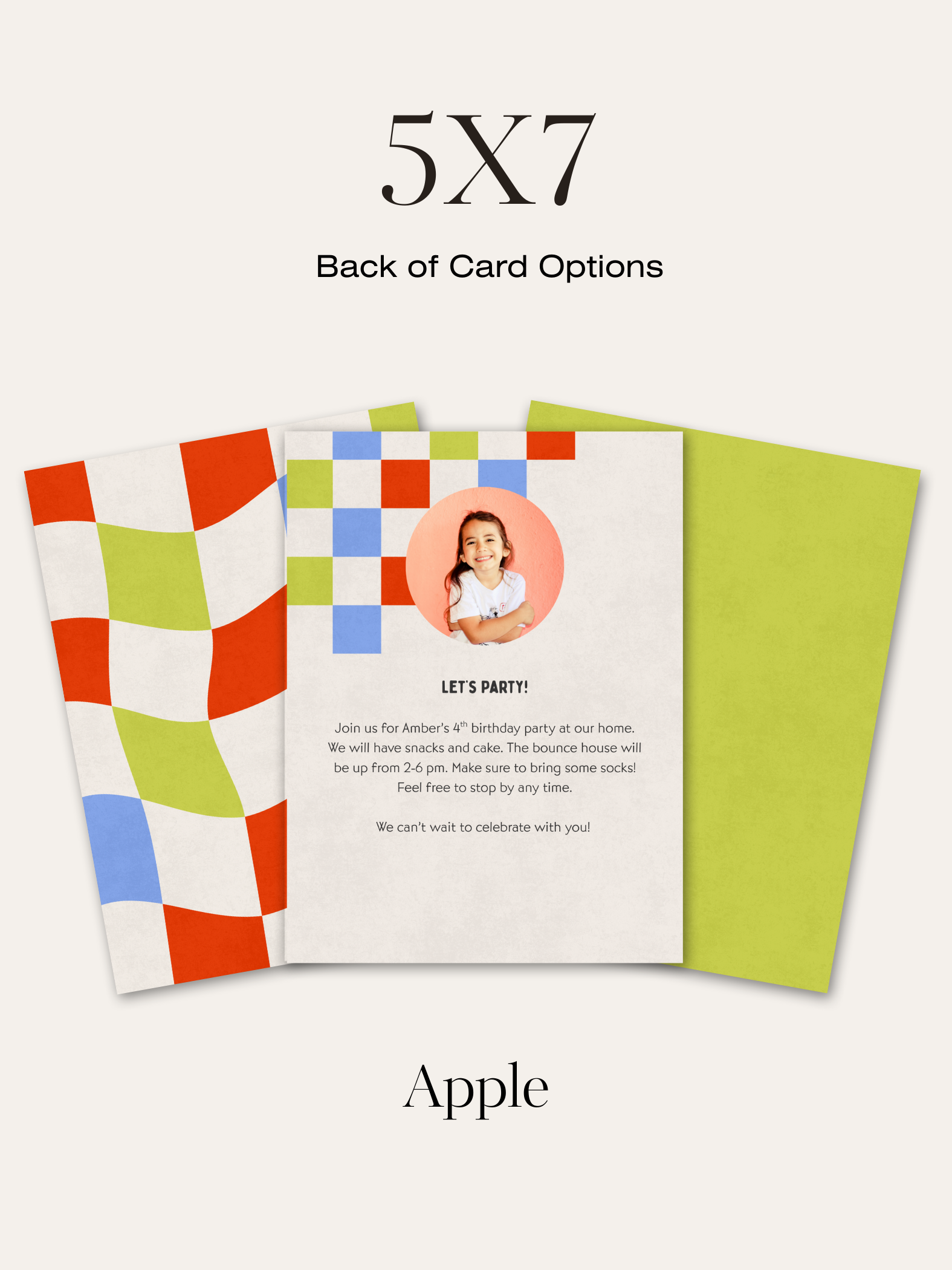 Set the tone for your party with the Checkered Invitation Suite. Designed in nine vibrant colorways, this essential starter pack includes both traditional and postcard invitations plus matching envelopes and liners.