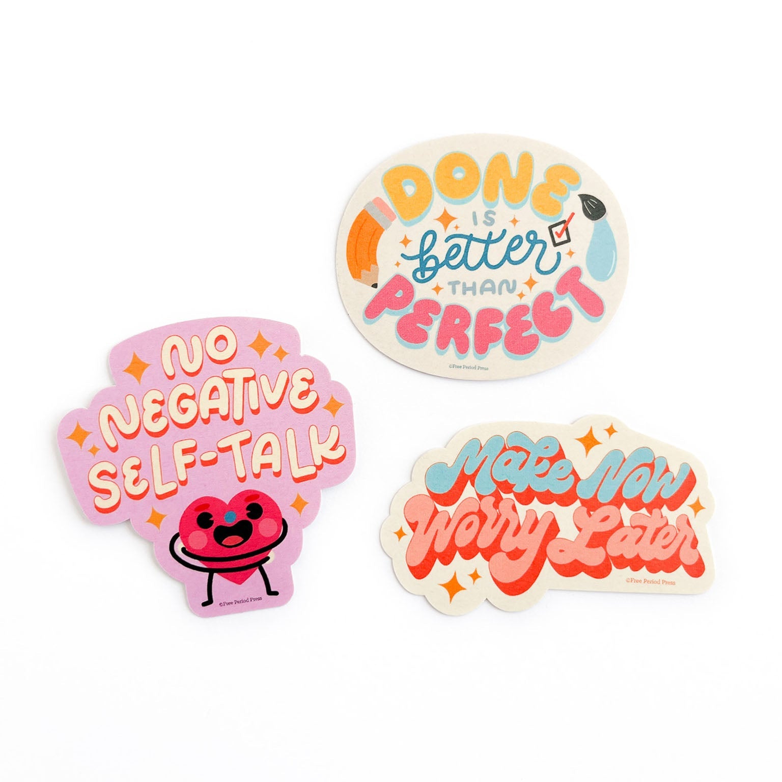 We're so excited to launch our collaboration with Chibia Ulinwa! This sticker pack includes all three stickers she designed for us: Done Is Better Than Perfect, Make Now, Worry Later and No Negative Self Talk.