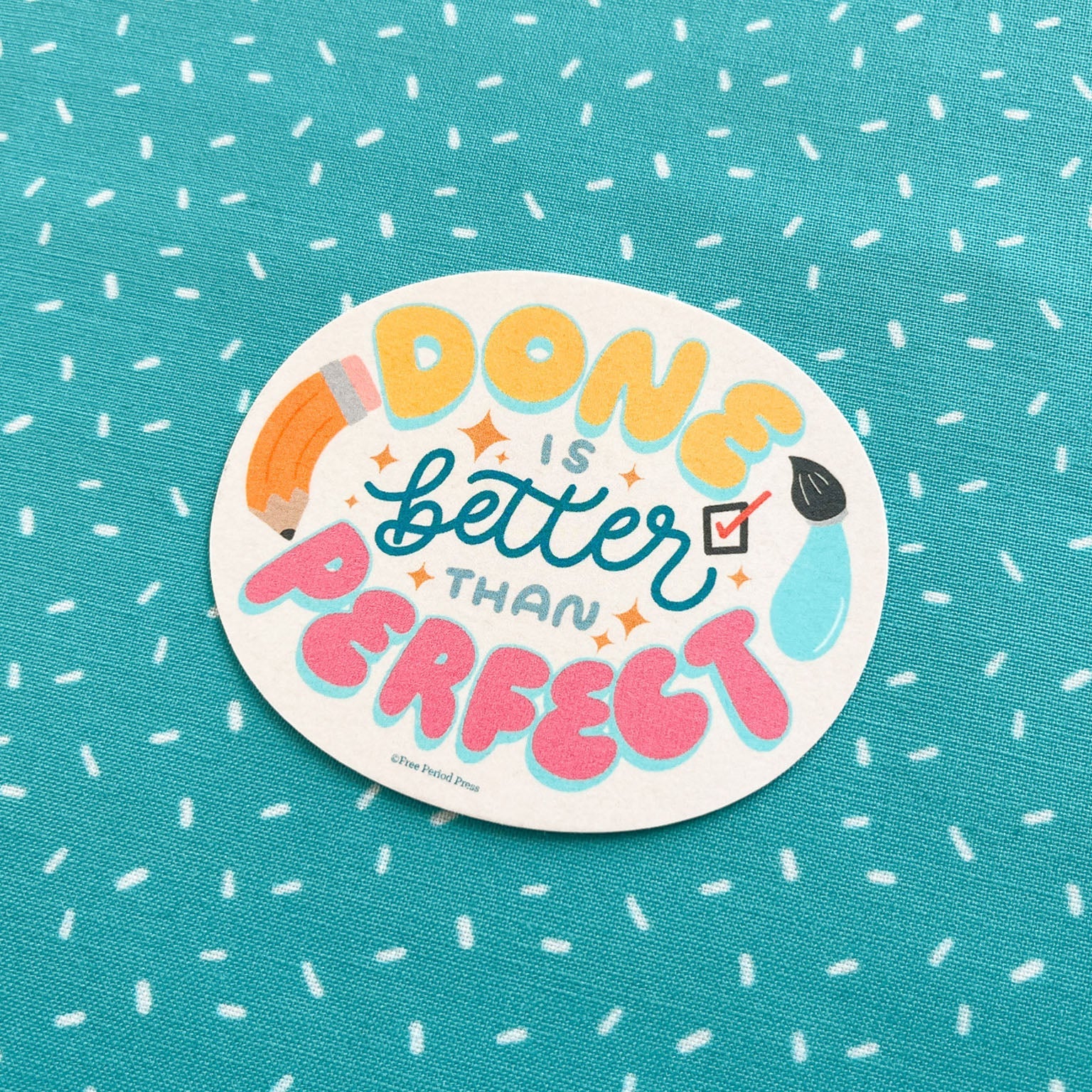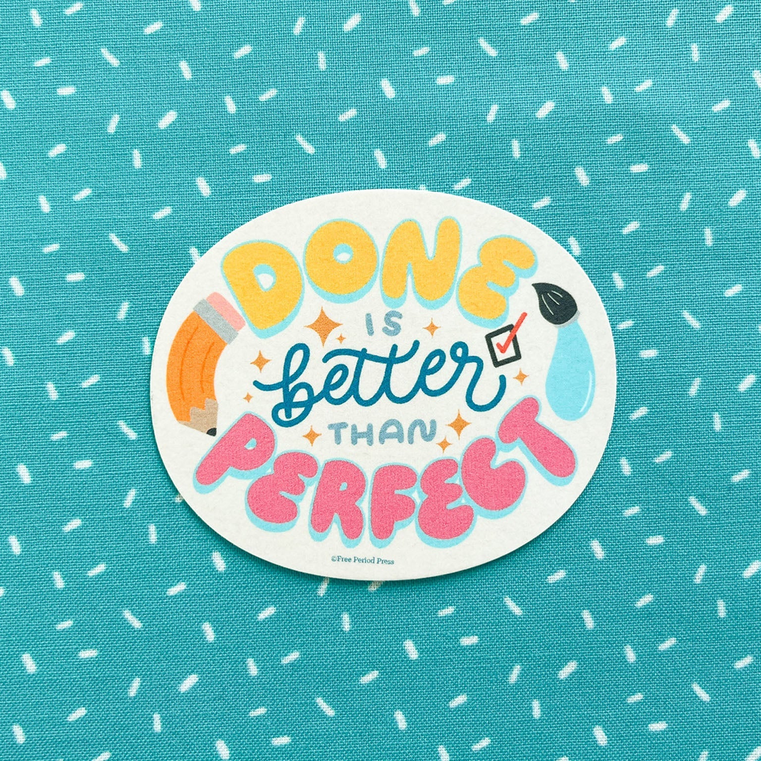 - Text: "Done Is Better Than Perfect" multi colored hand lettering