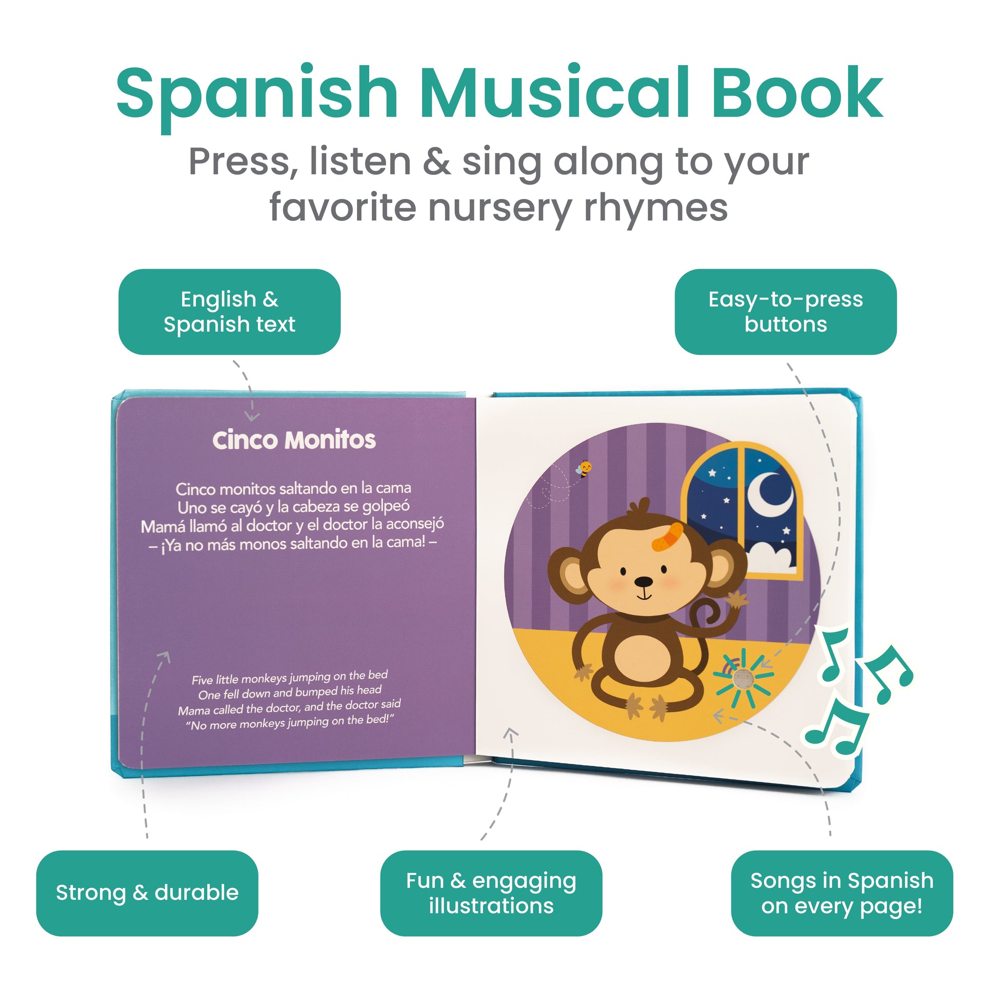 This charming book of nursery rhymes is part of our growing line of bilingual children’s books and Spanish sound books, designed to help families nurture language skills while sharing sweet moments together. From playful songs like Cinco monitos to calming lullabies like Duérmete niño, these melodies will become a treasured part of your child’s bilingual journey.