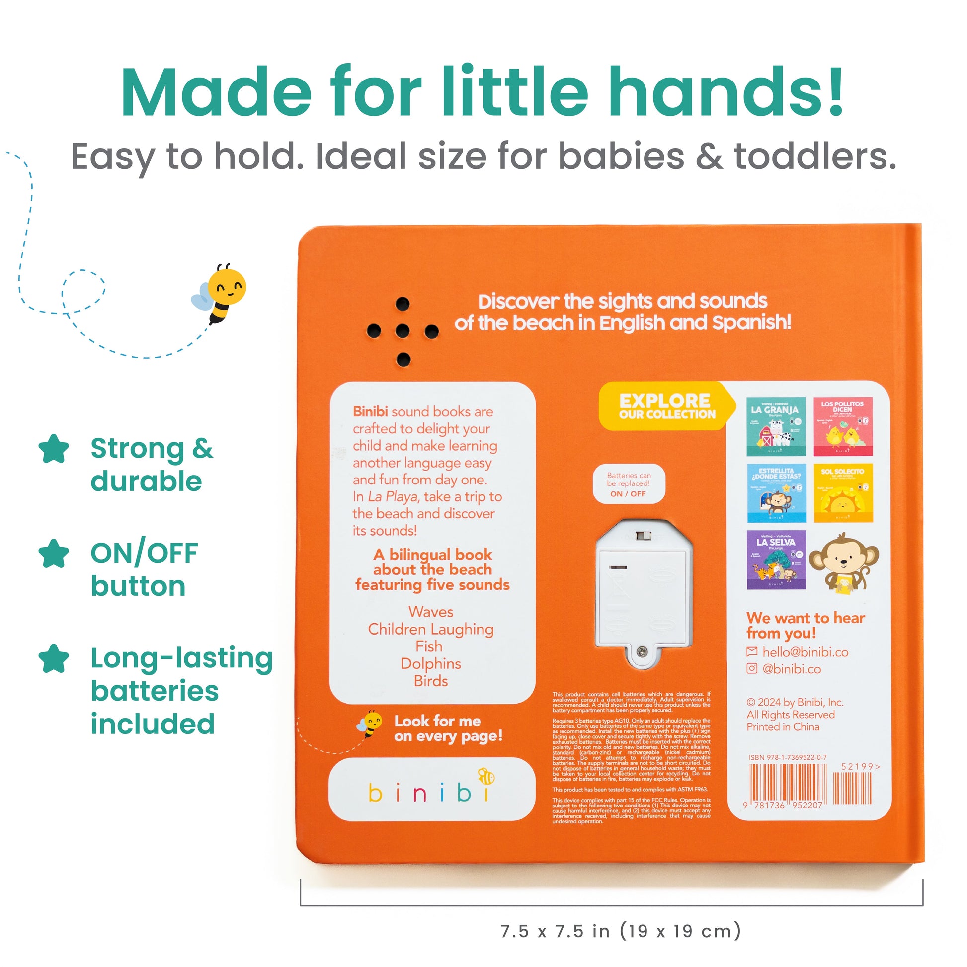 - Easy-to-press sound buttons that play five realistic beach sounds, helping children associate words with sounds in both Spanish and English.