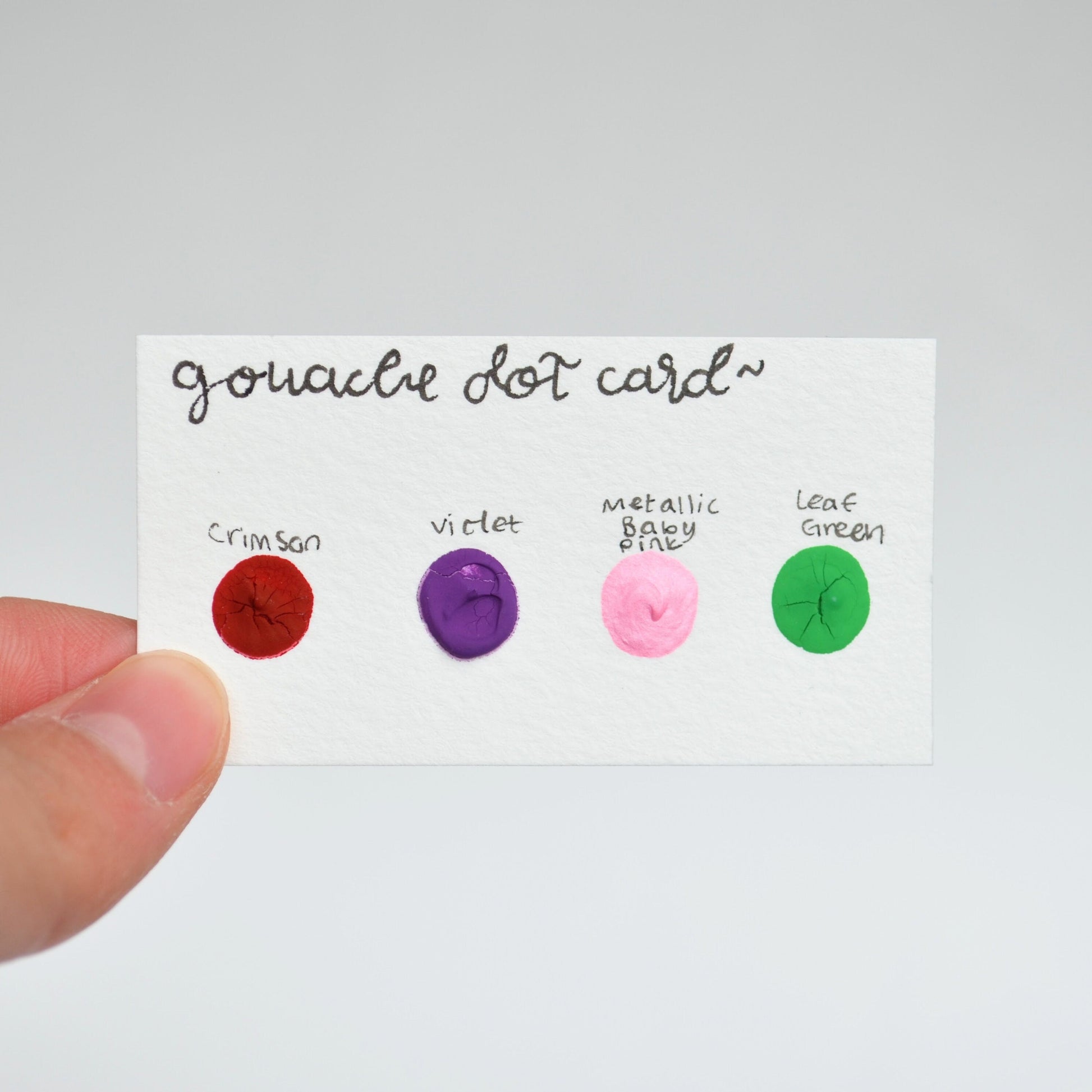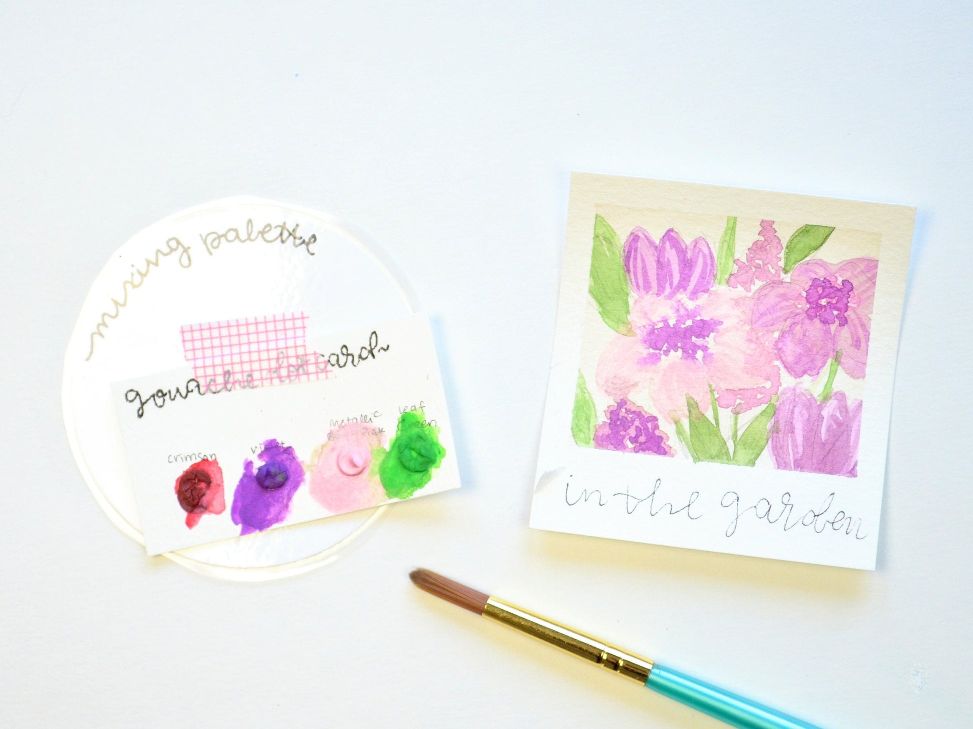 This kit comes with a pre-taped watercolor paper card, a mini gouache palette with four colors, and a sheet of instructions. The 'Pretty Pink Florals' kit gouache palette includes crimson, violet, metallic baby pink, and leaf green.