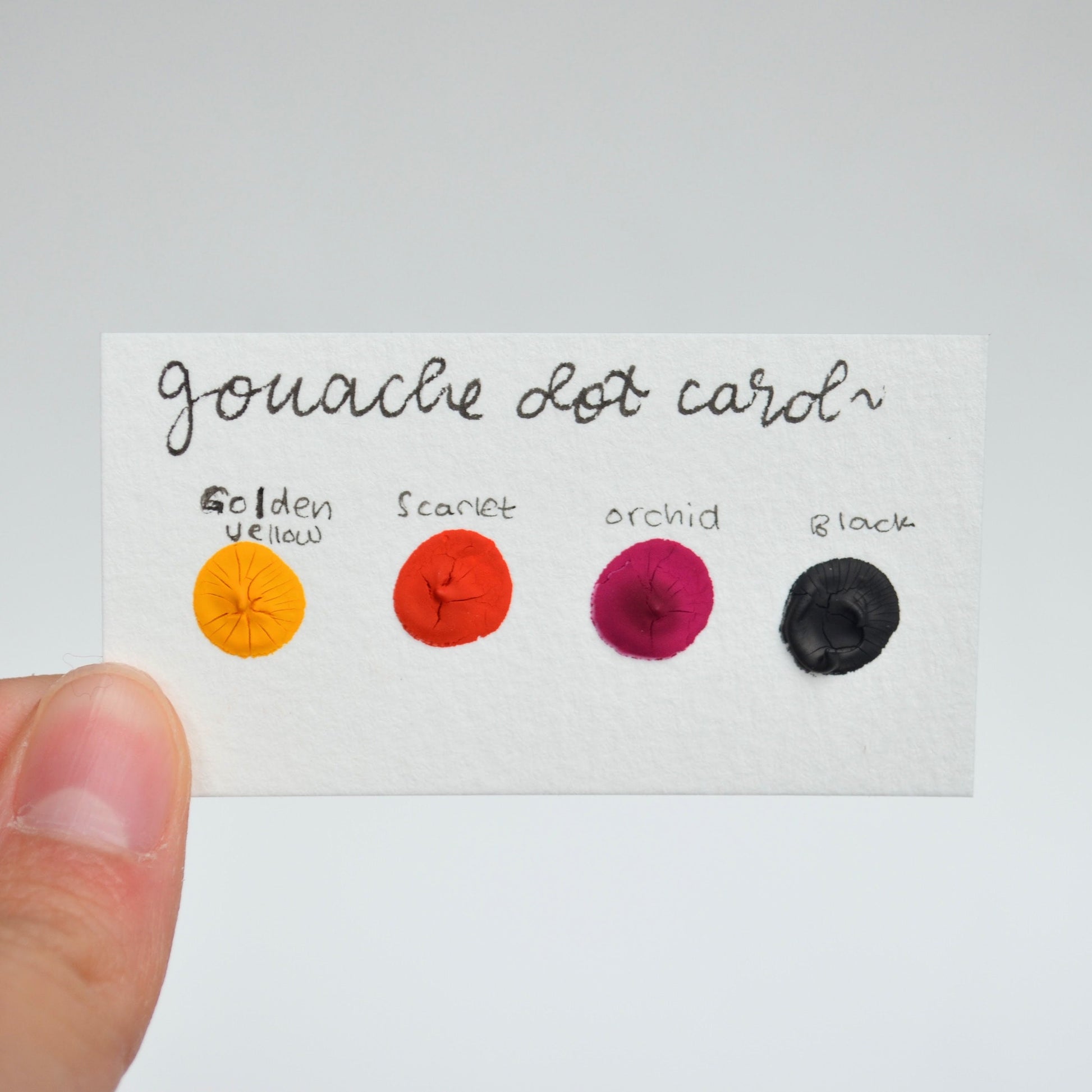 This kit comes with a pre-taped watercolor paper card, a mini gouache palette with four colors, and a sheet of instructions. The 'Sunset' kit gouache palette includes golden yellow, scarlet red, orchid, and black.